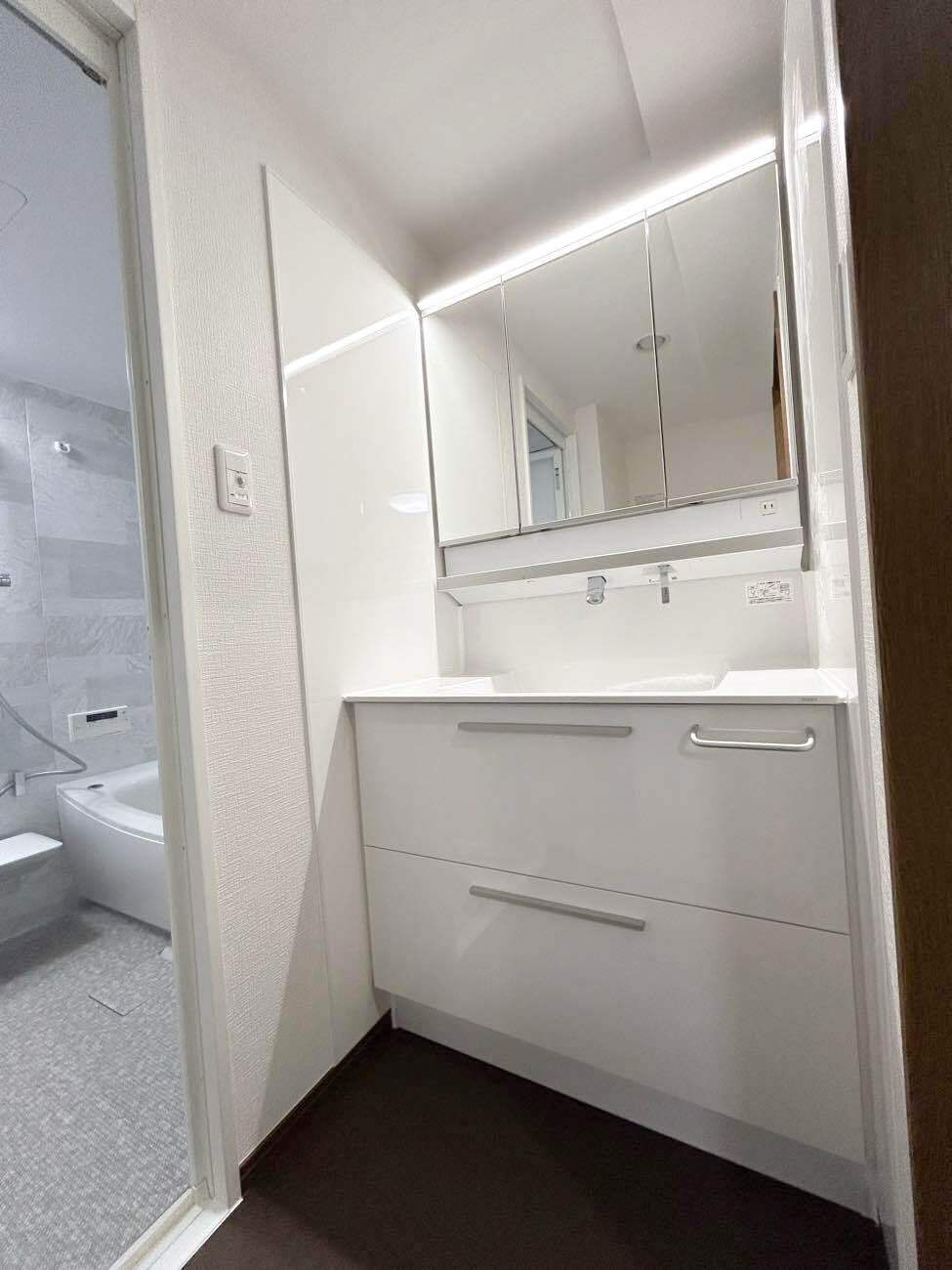 浴室と合わせて、洗面空間もシンプルで明るく、清潔感のある仕上がりとなっています。